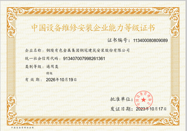 • 中國(guó)設(shè)備維修安裝企業(yè)能力等級(jí)證書(shū)